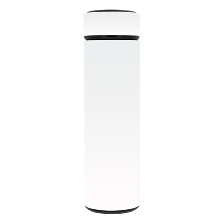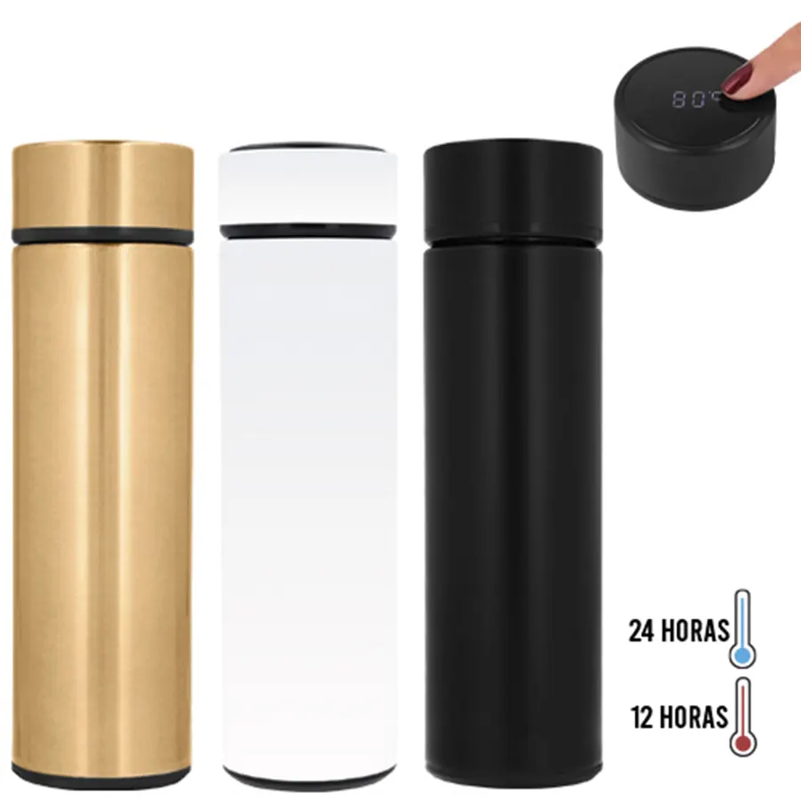 Termo con doble pared de acero inoxidable con termómetro digital que mide la temperatura de tu bebida, colador metálico y tapa enroscable. Incluye batería.