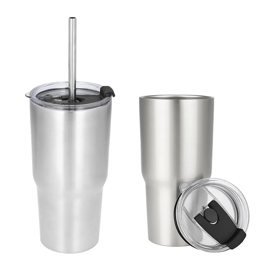 Termo con doble pared de acero inoxidable con tapa traslúcida y cierre a presión, boquilla de seguridad de plástico, boquilla de silicón cubre popote y popote metálico incluido.