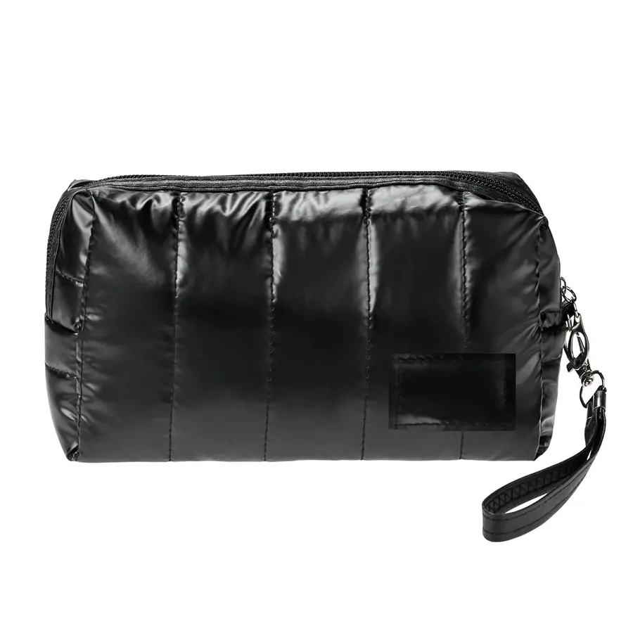 Cosmetiquera con interior forrado, placa, cierre y correa.
