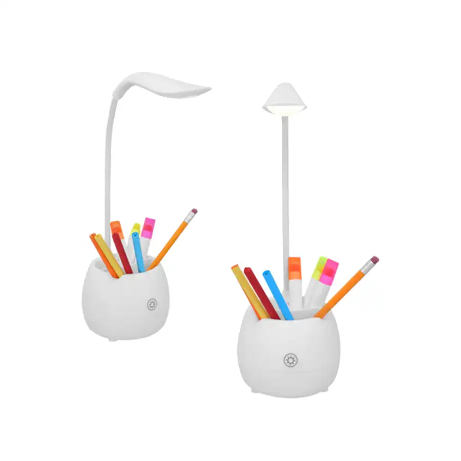 Lámpara portátil con luz LED, lapicero, base y soporte flexible de plástico, con modificador de intensidad touch. Incluye cable de carga.