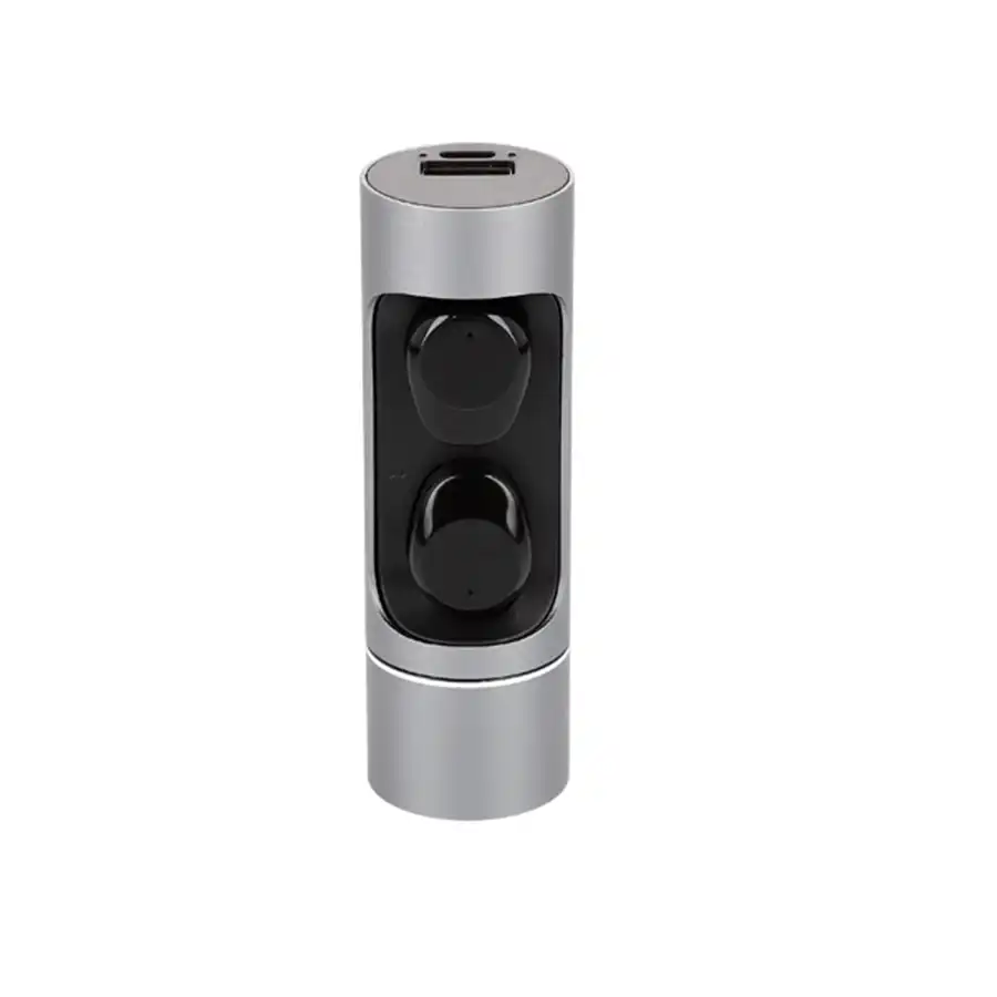 Audífonos bluetooth con botón de encendido/apagado y mecanismo touch. Incluye estuche de aluminio recargable con power bank integrada, gomas de repuesto y cable de carga.