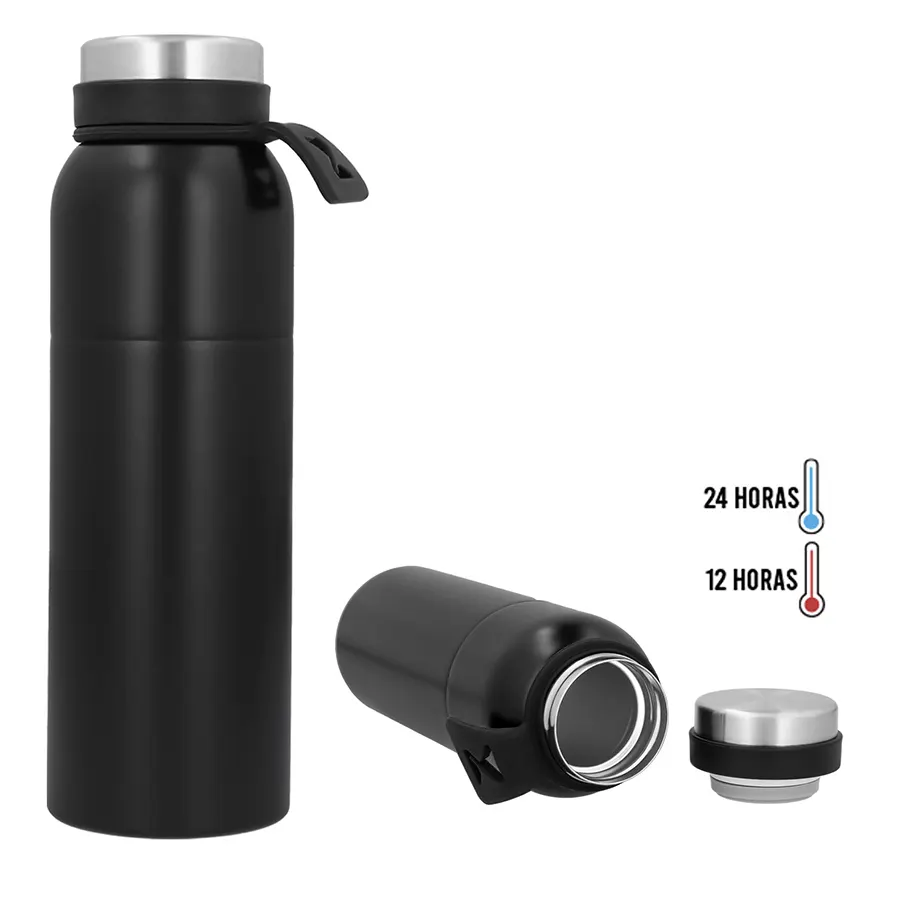 Termo con doble pared de acero inoxidable, tapa metálica enroscable, base y asa de silicón.