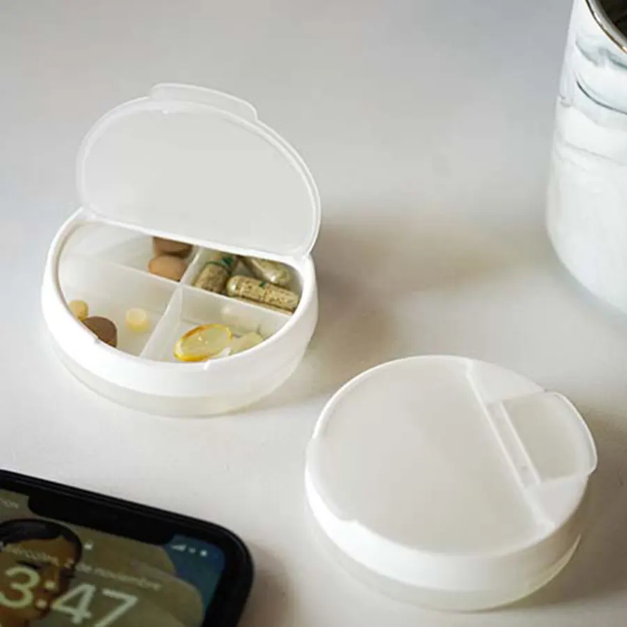 Pastillero de plástico con 4 compartimentos, 2 broches, tapa traslúcida y parte superior giratoria.