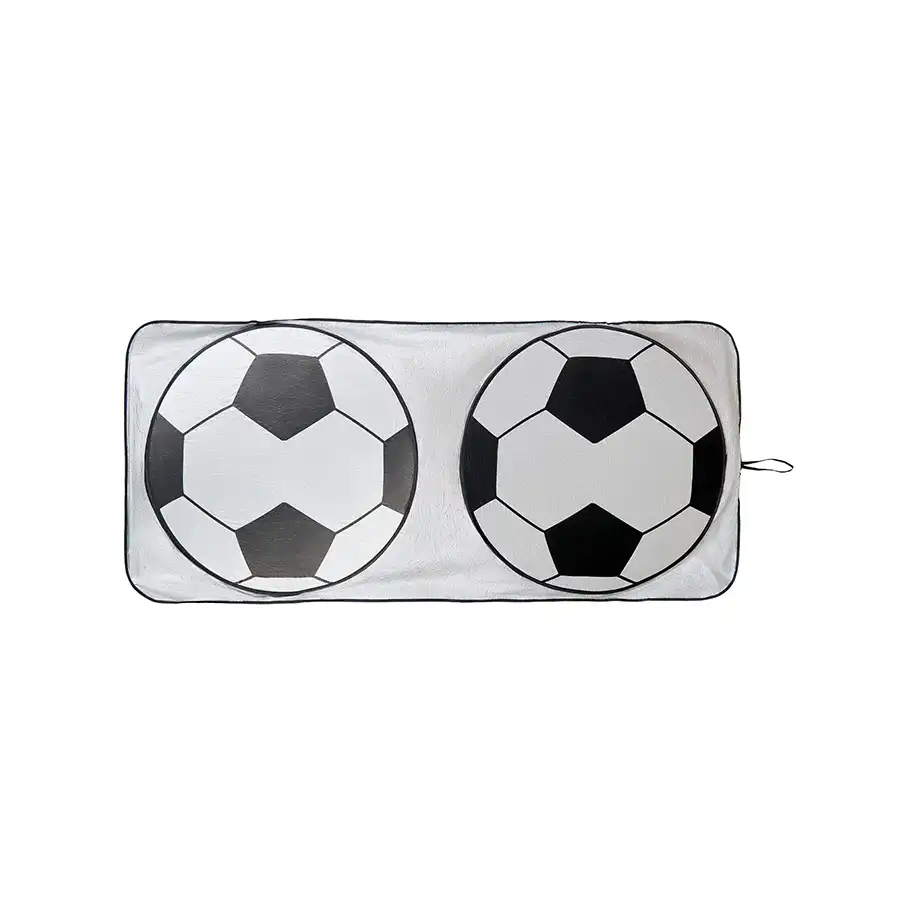 Parasol panorámico plegable de poliéster para auto con impresión de balón y funda para guardar.
