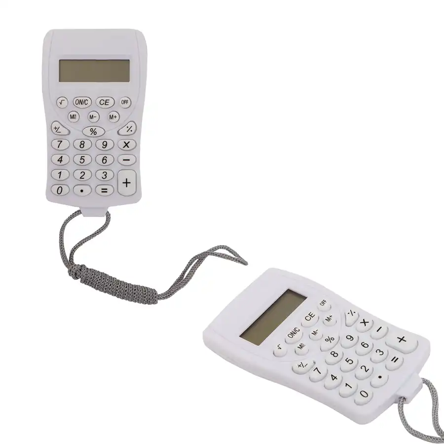 Calculadora de bolsillo con cordón. Incluye baterías.