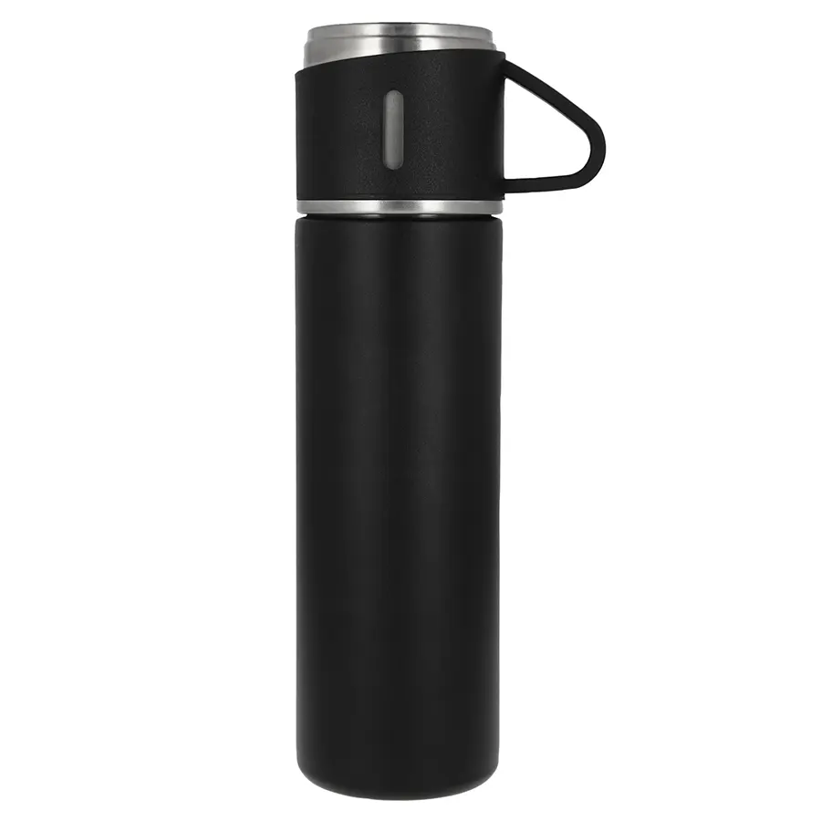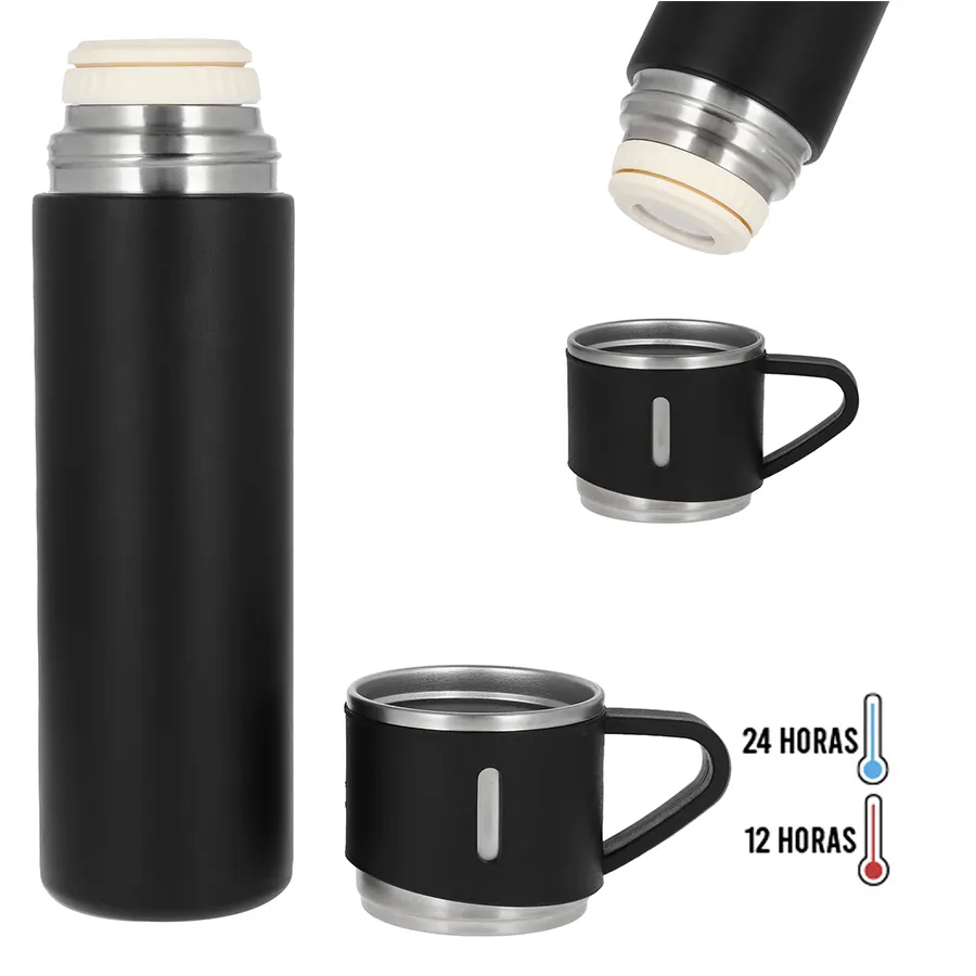 Termo con doble pared de acero inoxidable insulado al vacío. Acabado rugoso y tapa de rosca con asa que se utiliza como taza.