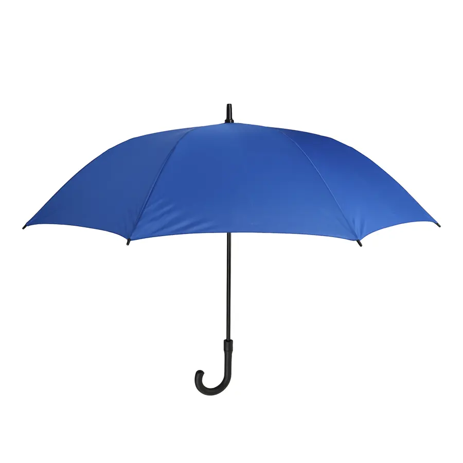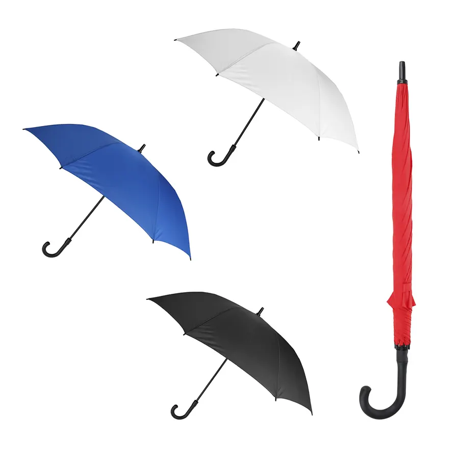 Paraguas de pongee con botón de apertura automática, 8 gajos, mango de plástico y cinta con velcro.
